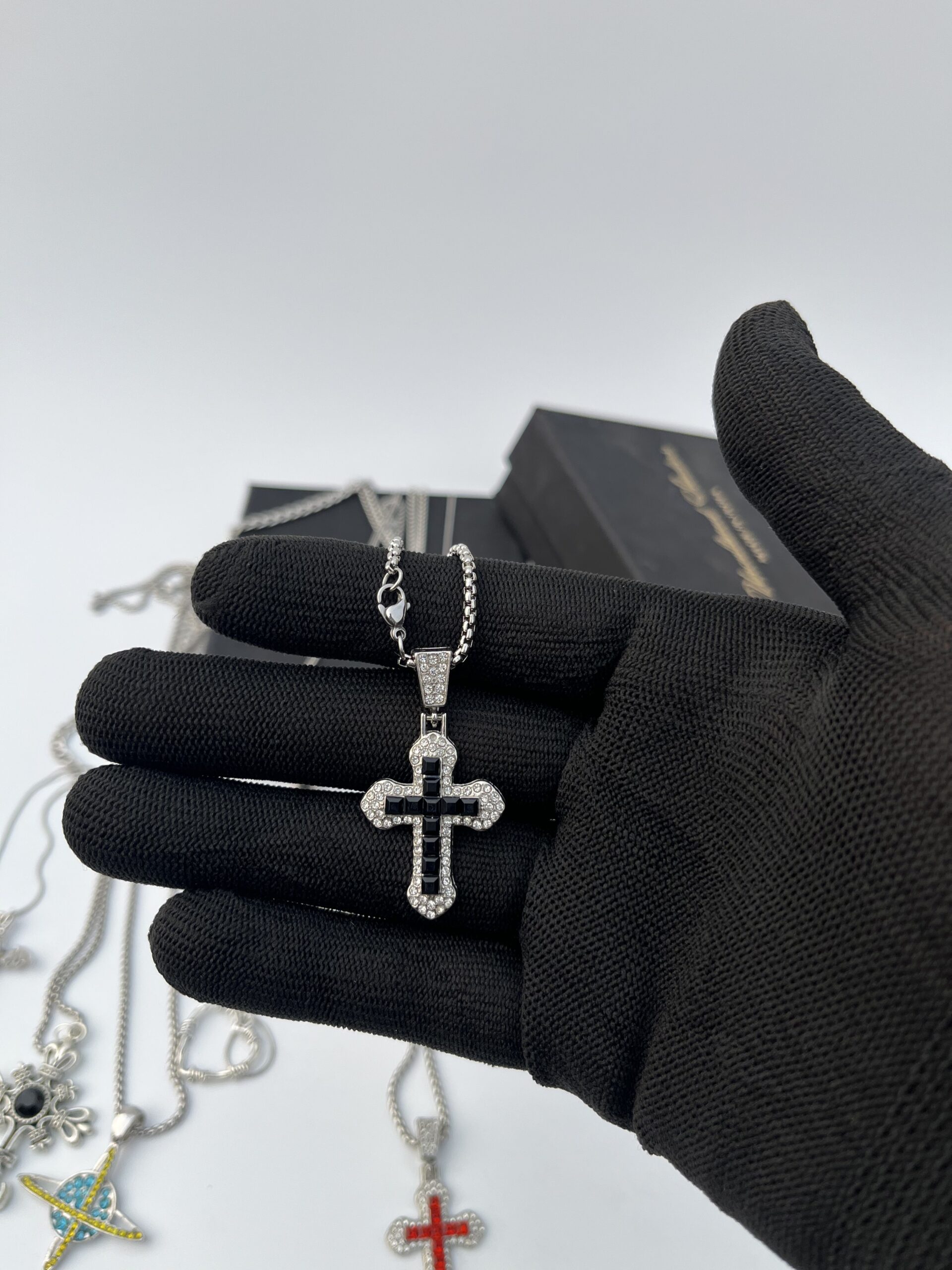 A heavy-set cross featuring a mosaic of black stones bordered by a brilliant crystal halo.