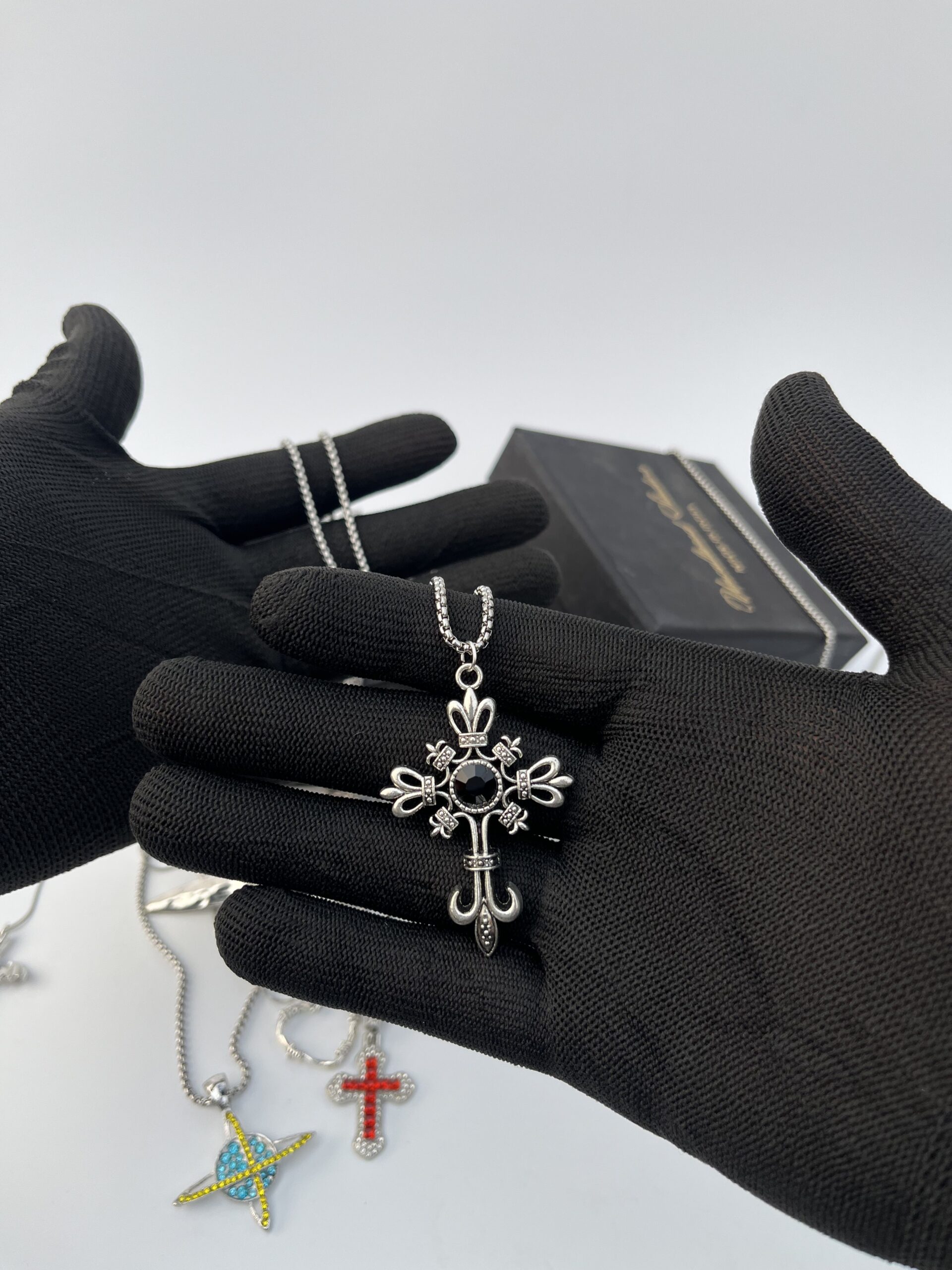 Gothic-inspired cross featuring a central obsidian-tone stone and Fleur-de-lis detailing.